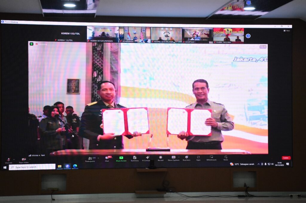 Palu,,PATROLI86.COM,, Danrem 132/Tdl Brigjen TNI Dody Triwinarto, S.I.P., M.Han,. didampingi Kasiter Kasrem 132/Tdl kolonel Inf Kolonel Inf Fifin Zudi Syaifuddin, S.pd., dan Pasiter Korem 132/Tdl Mayor Udik., mengikuti Vicon Acara penandatanganan Nota Kesepahaman Antara Menteri Pertanian RI dengan Panglima TNI yang dilaksanakan di Aula Songgolangi Makorem 132/Tdl Jl. Jenderal Sudirman, Kota Palu, Provinsi Sulawesi Tengah, Senin (4/12/23).