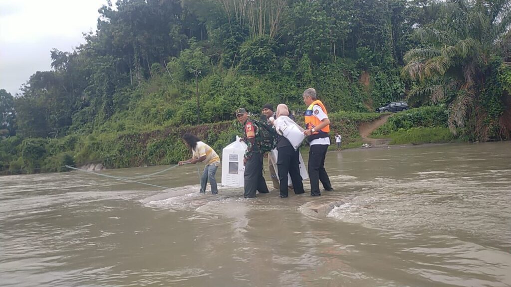 “Diperjalanan kami banyak menemui hambatan seperti menyeberangi sungai, jalan setapak yang licin dan berlumpur sehingga pendistrubusian logistik Pemilu ini kami lakukan secara estafet,” ucap Serda Aliman.