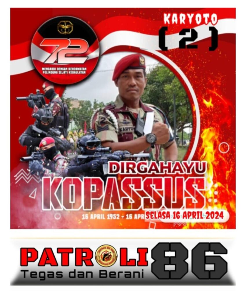 BOYOLALI – PATROLI86.COM “Hari ini, 16 April 2024, Kopassus merayakan ulang tahun ke-72. Semangat juang Kami tidak pernah padam. Dedikasi Kami untuk bangsa dan negara tidak pernah luntur,” Ucap KYT.