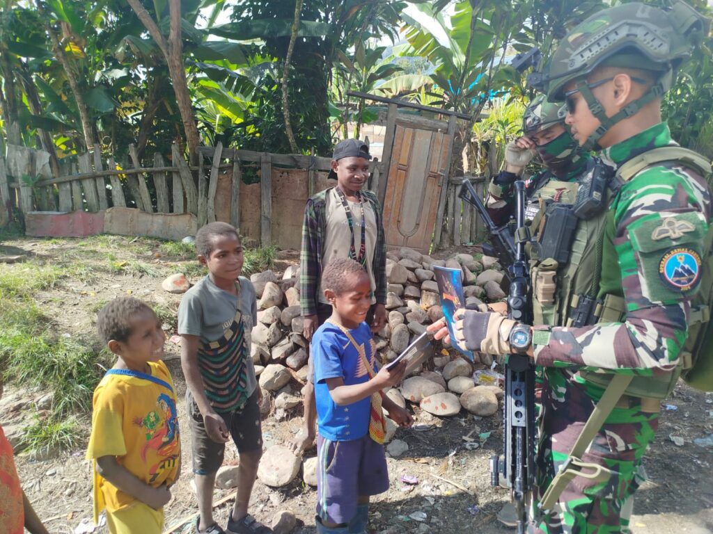 Dengan tetap mengutamakan keamanan selama kegiatan, interaksi komunikasi yang harmonis antara para Prajurit TNI dengan para warga semakin terjalin dengan inisiatif pembagian alat-alat tulis kepada anak-anak Bilogai. Kegembiraan anak-anak langsung terlihat dari senyum dan tawa lebar sesaat setelah menerima pemberian cuma-cuma para Prajurit TNI.