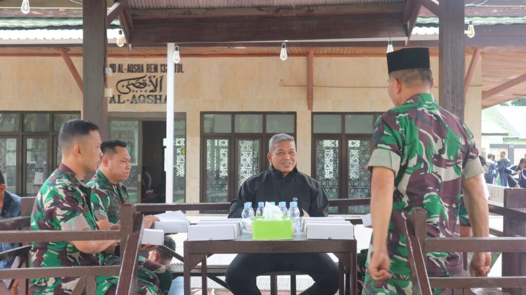 Setelah sholat Jumat, para prajurit Korem 132/Tdl dan masyarakat sekitar melanjutkan dengan kegiatan berbagi berkah makan bersama