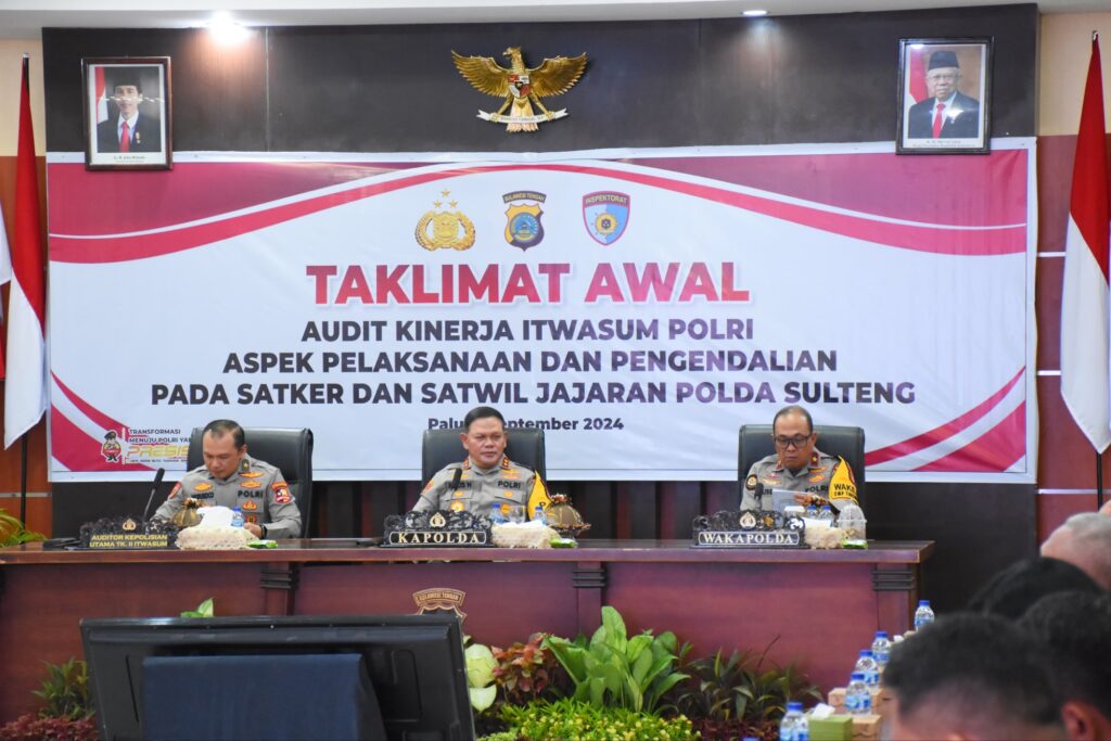 Taklimat Awal dalam rangka Audit Kinerja Itwasum Polri dibuka Kapolda Sulteng Irjen Pol. Dr. Agus Nugroho dan diikuti Irwil IV Itwasum Polri Brigjen Pol. Herukoco, M.Si, Wakapolda Sulteng Brigjen Pol. Soeseno Noerhandoko, tim Audit Itwasum, pejabat utama Polda Sulteng dan Kapolres jajaran di Rupatama Polda Sulteng, Senin (2/9/2024).