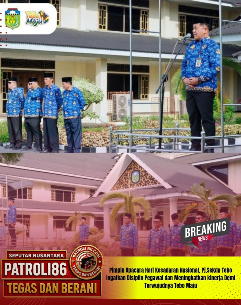 Patroli86.com,,Tebo – Pemerintah Kabupaten Tebo melaksanakan upacara bendera dalam rangka memperingati Hari Kesadaran Nasional Tahun 2025. Upacara tersebut dipimpin oleh Pj.Sekda Dr.Sindi.S.H.M.H Kabupaten Tebo, berlangsung di Halaman Kantor Bupati Tebo.Rabu (17/9/2025).
