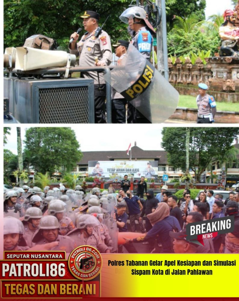 Polda Bali – patroli86.com ,, Polres Tabanan – Humas Tabanan. Polres Tabanan melaksanakan Apel Kesiapan dan Simulasi Sistem Pengamanan Kota (Sispamkota) pada Kamis (18/9/2025) bertempat di halaman depan Mako Polres Tabanan dan Jalan Pahlawan, Tabanan. Kegiatan dimulai pukul 09.45 Wita hingga 15.00 Wita, dipimpin langsung oleh Kapolres Tabanan AKBP I Putu Bayu Pati, S.I.K., M.H., serta dihadiri Wakapolres, PJU Polres, Kapolsek Tabanan, dan personel jajaran yang terlibat dalam simulasi.
