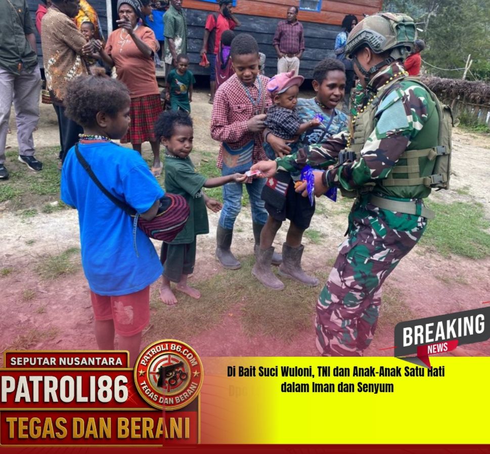 [ WULONI, PAPUA ]– patroli86.com ,, Dari balik jeruji jendela gereja sederhana di Kampung Wuloni, (21/9/2025), alunan pujian mengudara, menyatu dengan gemericik sungai dan desir angin pegunungan. Namun, yang lebih menggema dari nyanyian rohani adalah tawa riang puluhan anak-anak yang berdesakan seusai ibadah. Inilah pemandangan mengharukan yang ditorehkan oleh prajurit Pos Wuloni Satgas Yonif 700/Wyc, sebuah lukisan indah tentang kebersamaan yang ditulis dengan tinta iman dan permen.