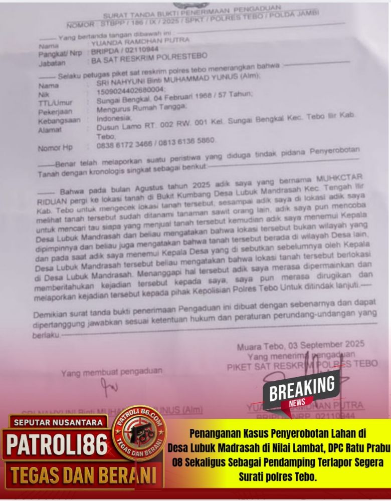 Ketua DPC Ratu Prabu 08,sekaligus sebagai pendamping pelapor MUKHTAR dan rekan nya, melalui watshap,Ratu Prabu 08 telah menghubungi piket jaga POLRES TEBO 16 Sept 2025 lalu BRIPDA YUANDA RANDHANI PUTRA , terkait laporan sdr MUKHTAR tentang kapan di laksanakan proses pemanggilan kepada si terlapor, Namun penerima telpon tersebut menjawab : TUNGGU SAJA INFO – NANTI DI KABARI tanpa menyebut kapan hari dan tanggal nya sehingga ketua DPC Ratu Prabu 08 merasa ada yang janggal dalam sambungan ponsel tersebut dan perlu di ingatkan secara tertulis
