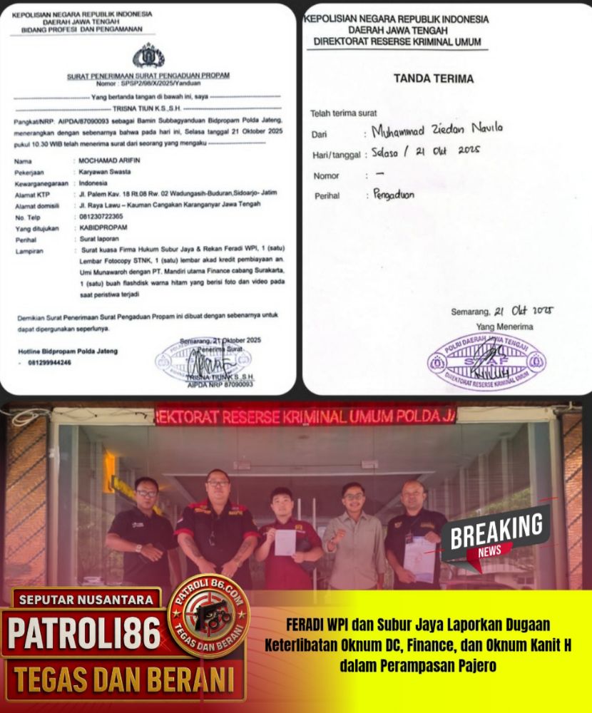 Semarang, Jawa Tengah – patroli86.com ,, Organisasi Advokat FERADI WPI bersama Firma Hukum Subur Jaya & Rekan secara resmi melaporkan dugaan keterlibatan oknum debt collector (DC), oknum perusahaan pembiayaan, dan oknum Kanit H Polsek Banjarsari terkait kasus perampasan mobil Pajero AD1346QP. Laporan ini diajukan di Polda Jawa Tengah pada hari Selasa, 21 Oktober 2025.