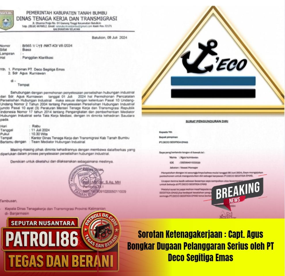 Tanah Bumbu, patroli86.com, 21/10/25, — Capt. Agus, mantan karyawan PT Deco Segitiga Emas, secara terbuka mengungkap dugaan pelanggaran hak-hak ketenagakerjaan yang dialaminya selama bekerja di perusahaan tersebut.