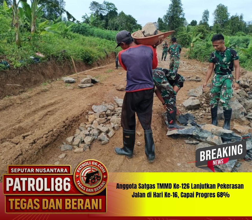 [ PANDEGLANG,, patroli86.com ,, 24 Oktober 2025 ] — Program TNI Manunggal Membangun Desa (TMMD) ke-126 Kodim 0601/Pandeglang terus menunjukkan perkembangan signifikan di berbagai sasaran fisik. Pada hari ke-16 pelaksanaan, anggota Satgas TMMD bersama warga masyarakat kembali melanjutkan kegiatan pengerasan jalan di lokasi utama sasaran fisik, dengan capaian progres yang telah mencapai 68 persen.