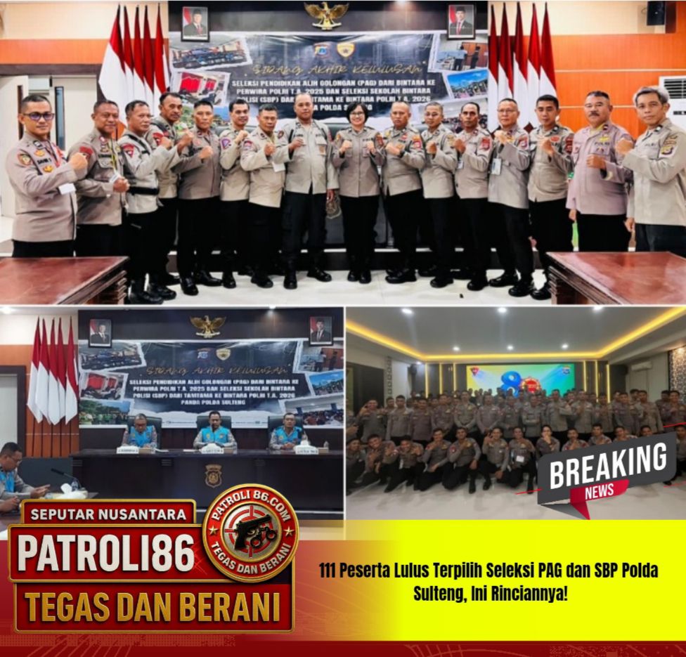 Palu – patroli86.com ,, Polda Sulawesi Tengah menggelar Sidang Akhir Kelulusan Seleksi Pendidikan Alih Golongan (PAG) Tahun Anggaran 2025 dan Seleksi Sekolah Bintara Polisi (SBP) Tahun Anggaran 2026. Kegiatan tersebut berlangsung di Aula Rupatama Polda Sulteng, Jumat (24/10/2025).