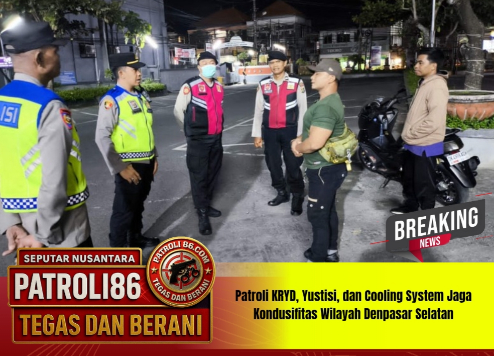Denpasar – patroli86.com ,, Personel Polsek Denpasar Selatan melaksanakan kegiatan Kegiatan Rutin Yang Ditingkatkan (KRYD), Yustisi, dan Cooling System pada Jumat malam (24/10/2025) guna mencegah terjadinya gangguan kamtibmas di wilayah hukumnya. Kegiatan dipimpin oleh Pawas IPTU Komang Juliarto, S.H., M.H., bersama Padal AIPTU I Made Muliyana, dan dipantau langsung oleh Kapolsek Denpasar Selatan AKP Agus Adi Apriyoga, S.I.K., M.H.Patroli menyasar sejumlah titik rawan di wilayah Denpasar Selatan pengawasan juga dilakukan di kawasan wisata, pertokoan, restoran, hotel, area parkir, serta pemukiman warga. Sasaran kegiatan difokuskan pada pencegahan tindak kejahatan seperti pencurian (C3), kepemilikan sajam dan senpi, peredaran miras, penggunaan knalpot bising, serta aksi balap liar yang kerap dilakukan anak muda.Selain patroli, personel juga memberikan imbauan kamtibmas kepada masyarakat agar tetap waspada terhadap potensi kejahatan dan segera melaporkan ke pihak kepolisian apabila membutuhkan bantuan melalui nomor 082247982949. Upaya ini dilakukan untuk memperkuat sinergi antara Polri dan masyarakat dalam menjaga keamanan dan ketertiban di wilayah Denpasar Selatan.Kapolsek Denpasar Selatan AKP Agus Adi Apriyoga, S.I.K., M.H., menyampaikan bahwa kegiatan KRYD, Yustisi, dan Cooling System merupakan bentuk langkah preventif untuk menjaga stabilitas kamtibmas. “Kami berkomitmen memberikan rasa aman kepada masyarakat dengan meningkatkan kehadiran polisi di lapangan dan mengedepankan pendekatan dialogis. Situasi wilayah Denpasar Selatan hingga kegiatan berakhir terpantau aman, tertib, dan kondusif,” ujarnya.