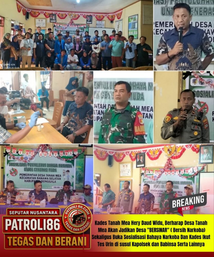Hal yang sama Kades Tanah Mea Hery Daud Widu mengatakan, Dalam sebuah acara dengan tofik : sosialisasi bahaya narkoba yang diadakan oleh Mahasiswa Kuliah Kerja Nyata ( KKN) peran kepala desa sangat penting, memberikan dukungan penuh, memang kegiatan ini permintaan dari pada Mahasiswa KKN, dan saya menyambut baik dan Apresiasi kegiatan sosialisasi bahaya Narkoba, olehnya saya menghubungi BNN Kabupaten Donggala untuk kerja sama dalam memberikan sosialisasi dan sekaligus diadakan tes urin oleh BNN di mulai dari Kepala Desa, Kapolsek Banawa Selatan Ipda Asri, SH, Babinsa desa Tanah Mea Usman, ketua BPD, Sekdes, dan aparat desa, dan masyarakat, dan bahkan awak Media juga ikut tes urin ujar Kades Tanah Mea Hery Daud Widu.
