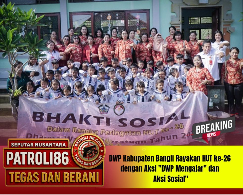 Bangli – patroli86.com ,, Dharma Wanita Persatuan (DWP) Kabupaten Bangli sukses menggelar serangkaian kegiatan inspiratif dalam rangka HUT DWP tahun 2025, yang meliputi program ‘DWP Mengajar’ dan Bhakti Sosial. Mengusung tema “Peran Strategis Dharma Wanita Persatuan dalam Pendidikan Anak Bangsa untuk Indonesia Emas 2045,” inisiatif ini fokus pada penanaman nilai-nilai kebangsaan dan pembentukan karakter sejak usia dini.