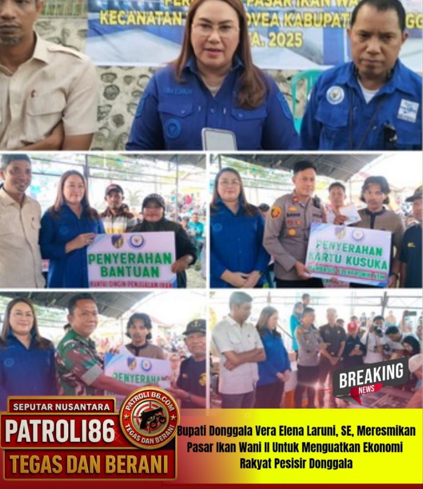 Melalui dukungan Pemerintah Kabupaten Donggala, hari ini kita serahkan ” Bantuan Modal Usaha perlapak penjualan Ikan, Fasilitas Rantai Dingin ( Cold Chain) untuk menjaga mutu hasil tangkapan para nelayan, Kartu KUSUKA Berbasis Elektronik ATM untuk memperluas Akses keuangan dan perlindungan sosial bagi Nelayan, serta pengelolaan pasar Ikan Wani II, kepada BUNDes Wani II, dan berbagai bentuk Pemberdayaan ekonomi desa yang mandiri dan berkelanjutan, demikian dikatakan Bupati Donggala Vera Elena Laruni, SE, Kepada Awak Media Ini di Lokasi Peresmian Pasar Ikan Wani II, Kecamatan Tanantovea, Kabupaten Donggala, Rabu, 11 November 2025.