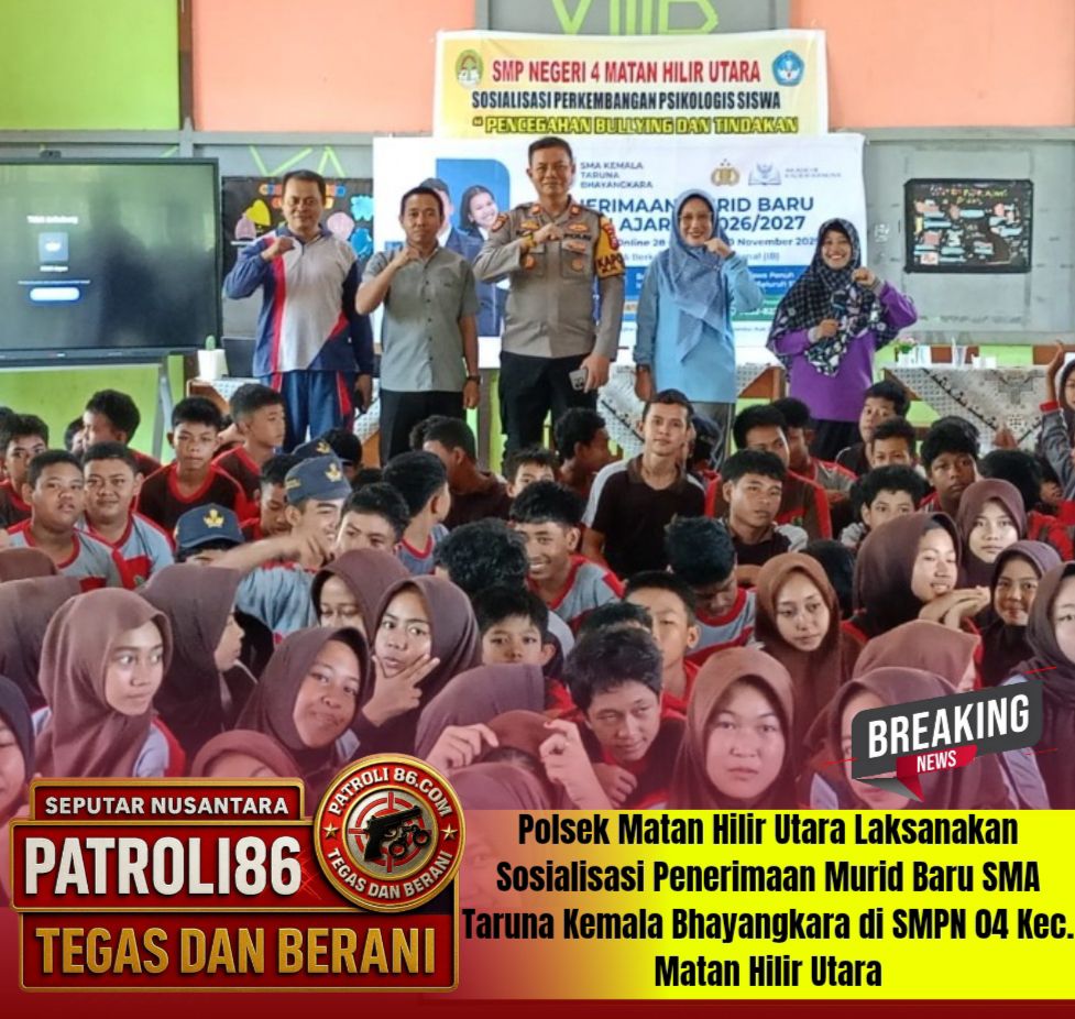 Ketapang, Polda Kalbar – patroli 86.com.Polsek Matan Hilir Utara melaksanakan kegiatan Sosialisasi Penerimaan Murid Baru (PMB) SMA Taruna Kemala Bhayangkara Tahun Ajaran 2026/2027 yang bertempat di SMP Negeri 04, Kecamatan Matan Hilir Utara, Kabupaten Ketapang, pada Jumat (14/11/2025).