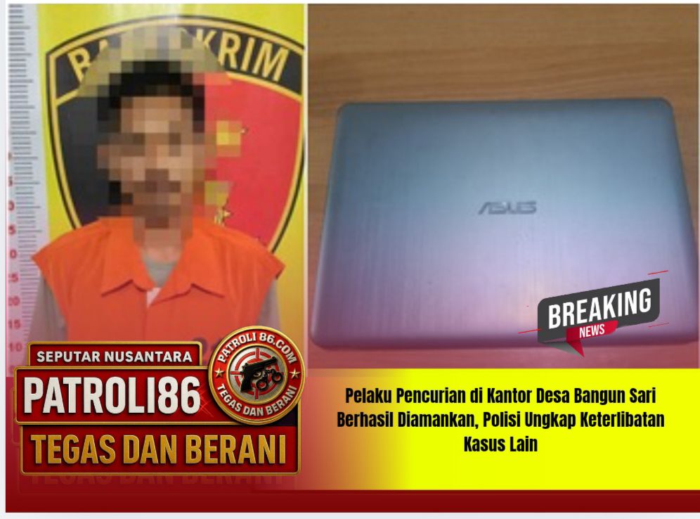 “Pelaku berinisial P (29) kami amankan setelah dilakukan penyelidikan mendalam. Dari hasil pemeriksaan, pelaku mengakui terlibat dalam pencurian di Kantor Desa Bangun Sari bersama satu orang rekannya yang saat ini masih dalam pengejaran,” ujar Kompol Edi Qorinas.