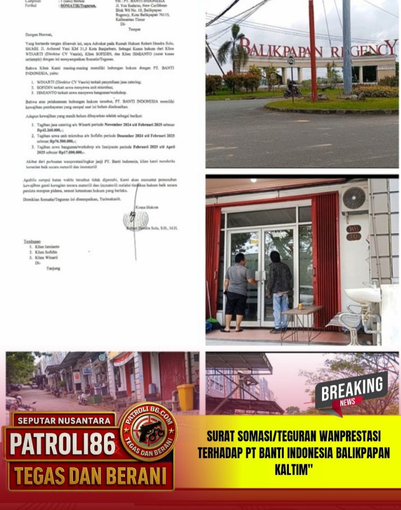 Tabalong –patrlo 86.com ,Berdasarkan No. Surat 02/RH-RHS/II/2026 perihal Somasi/Teguran kepada PT Banti Indonesia yang beralamat di Jl. Syarifuddin Yoes, Komp. Balikpapan Regency Ruko New Caribbean Blok W6 No.10, Kel. Sepinggan Baru, Kec. Balikpapan Selatan, Kota Balikpapan.