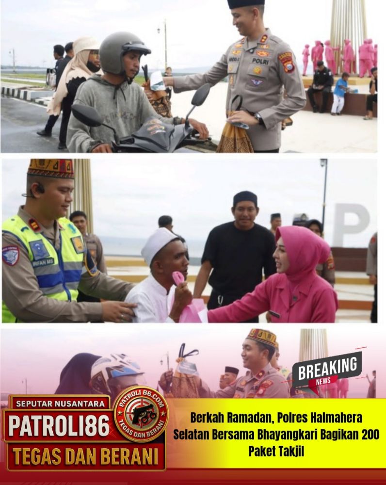 Halmahera Selatan//Patroli86.com// – Dalam rangka mengisi Bulan Suci Ramadan 1447 H dengan kegiatan positif dan penuh kepedulian, Polres Halmahera Selatan bersama Bhayangkari Cabang Halsel melaksanakan pembagian takjil kepada masyarakat, bertempat di Jalan Raya Pantai Mandaong, Kecamatan Bacan Selatan, Rabu (25/02/2026).