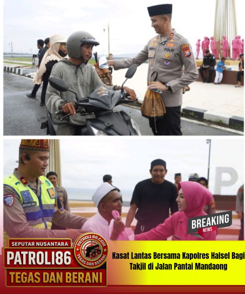 Halmahera Selatan//Patroli86.Com// – Dalam semangat berbagi di bulan suci Ramadan, Kasat Lantas bersama Kapolres Halmahera Selatan, Hendra Gunawan, turun langsung membagikan takjil kepada masyarakat di Jalan Raya Pantai Mandaong, Kecamatan Bacan Selatan, Kabupaten Halmahera Selatan.
