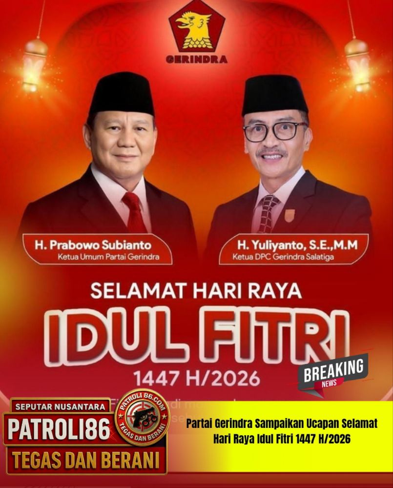 Salatiga,, PATROLI86.COM ,, 28 Maret 2026 – Partai Gerakan Indonesia Raya (Gerindra) melalui Ketua Umumnya H. Prabowo Subianto beserta Ketua DPC Gerindra Salatiga H. Yuliyanto, S.E., M.M., menyampaikan ucapan selamat Hari Raya Idul Fitri 1447 Hijriah/2026 kepada seluruh umat Muslim di Indonesia.