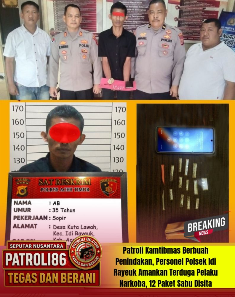 Patroli 86.com ,, Patroli kamtibmas yang digelar personel Polsek Idi Rayeuk, Polres Aceh Timur, membuahkan hasil. Seorang pria yang diduga terlibat penyalahgunaan narkotika jenis sabu berhasil diamankan bersama sejumlah barang bukti, Rabu (08/04/2026) dini hari.