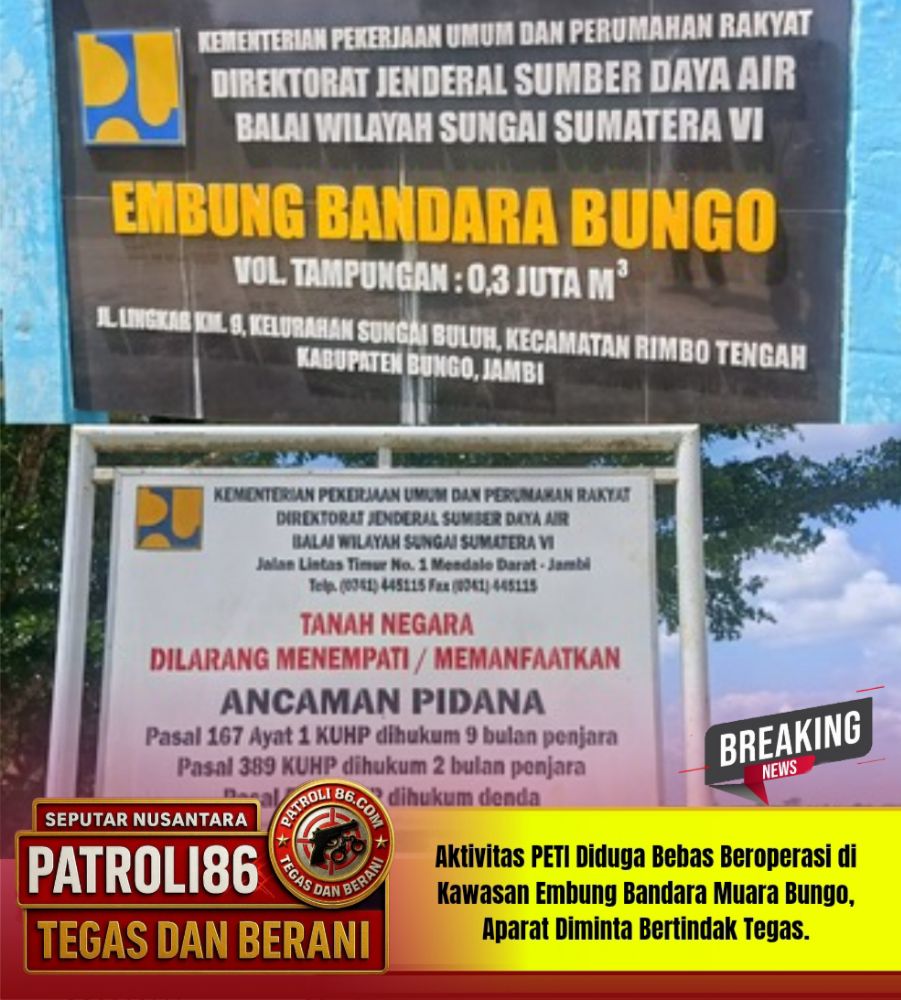 Bungo : patroli 86 com Aktivitas Penambangan Emas Tanpa Izin (PETI) kembali menjadi sorotan. Kali ini kegiatan ilegal tersebut terpantau marak beroperasi di kawasan Embung Bandara Muara Bungo, Kabupaten Bungo, Provinsi Jambi.