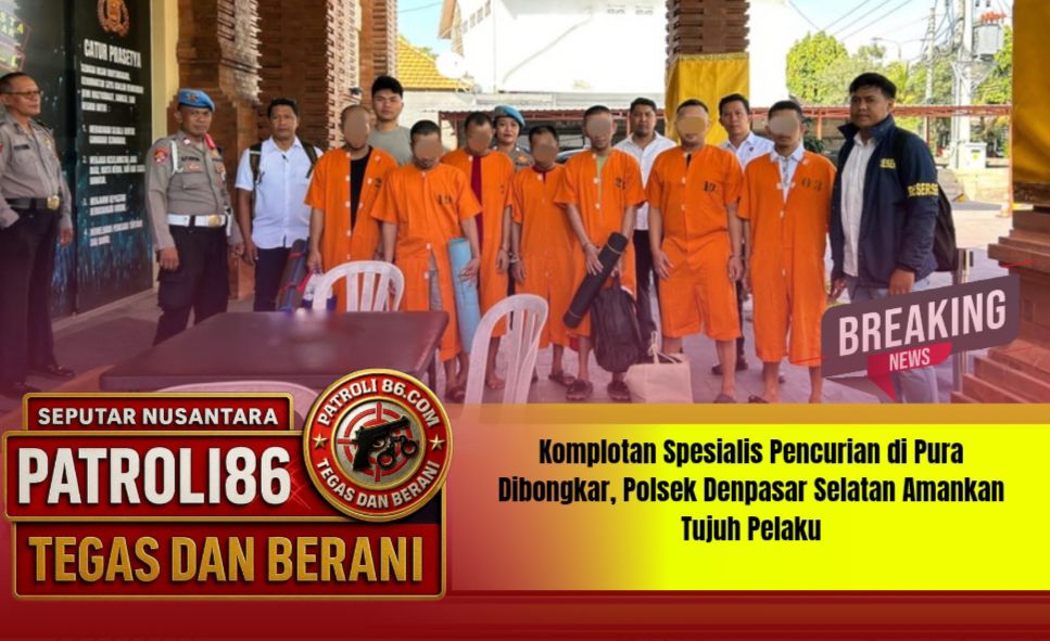 Denpasar – patroli 86.com ,, Aksi komplotan spesialis pencurian yang menyasar tempat ibadah umat Hindu di wilayah Denpasar akhirnya berhasil diungkap oleh Unit Reskrim Polsek Denpasar Selatan bersama Polresta Denpasar. Dalam pengungkapan tersebut, sebanyak tujuh pelaku berhasil diamankan, yang seluruhnya diduga tergabung dalam jaringan pencurian benda sakral di pura.