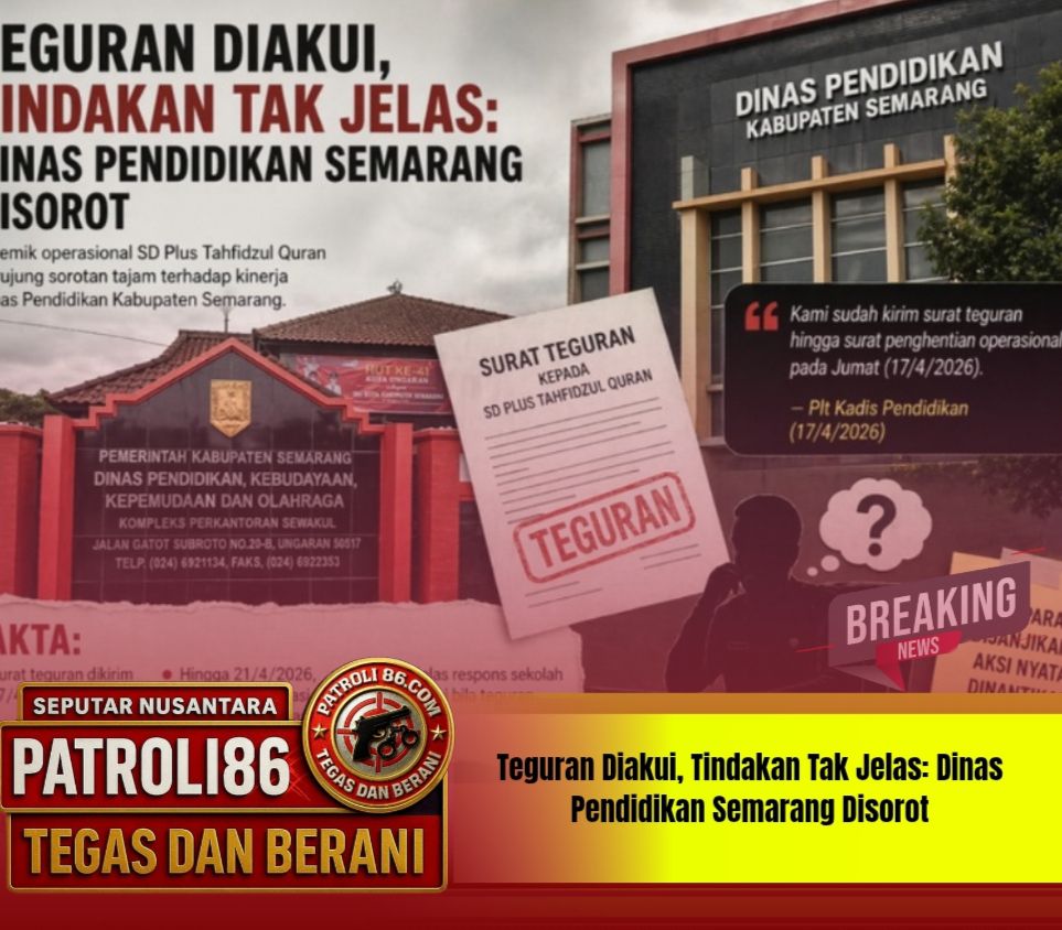 Kab Semarang, – patroli 86.com ,, Penanganan polemik operasional SD Plus Tahfidzul Quran di Kabupaten Semarang menuai sorotan tajam. Dinas Pendidikan dinilai lalai dan tidak transparan dalam menindaklanjuti persoalan yang sudah berlangsung cukup lama.