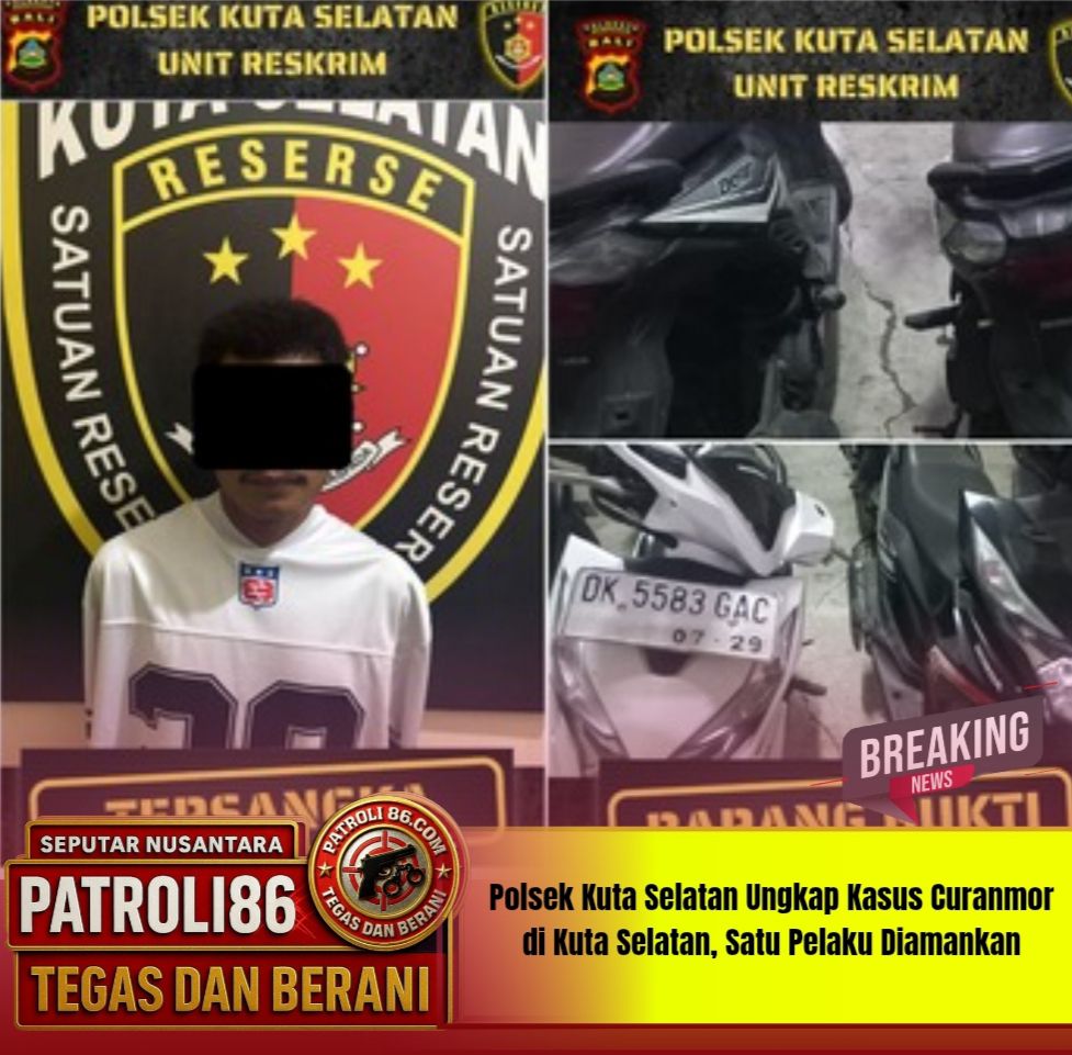 Denpasar – patroli 86.com ,, Unit Reskrim Polsek Kuta Selatan berhasil mengungkap kasus pencurian sepeda motor (curanmor) yang terjadi di Jalan Siligita, Lingkungan Bualu, Kelurahan Benoa, Kecamatan Kuta Selatan, Kabupaten Badung. Dalam kasus ini, satu pelaku berinisial YH (21) berhasil diamankan, sementara satu pelaku lainnya masih dalam pengejaran (DPO).